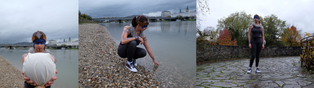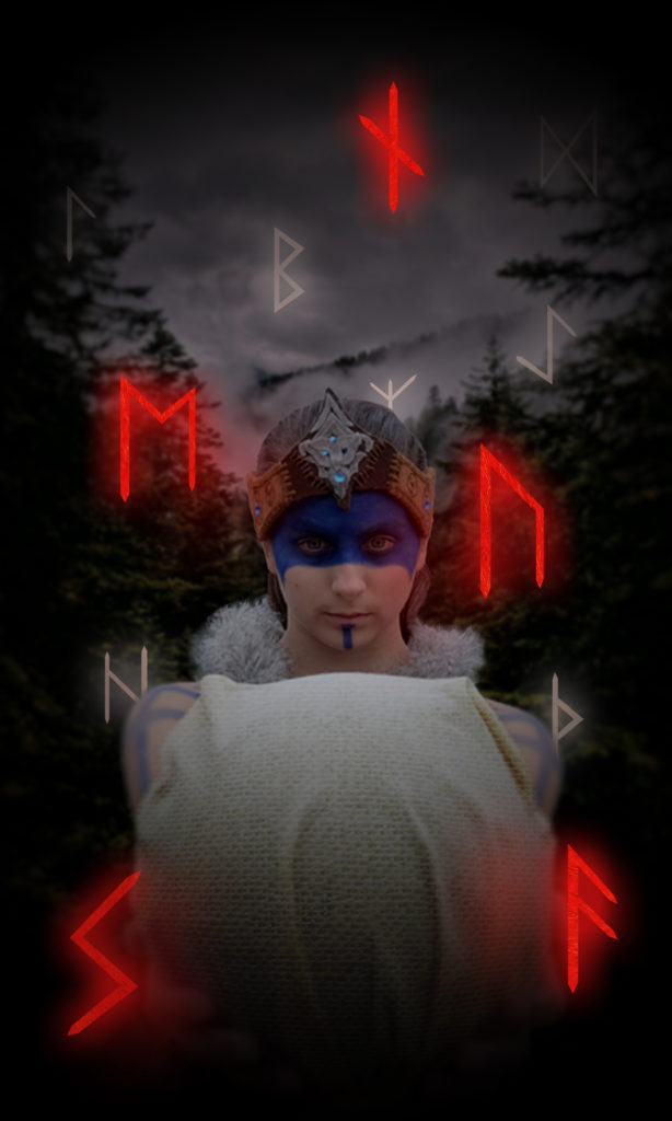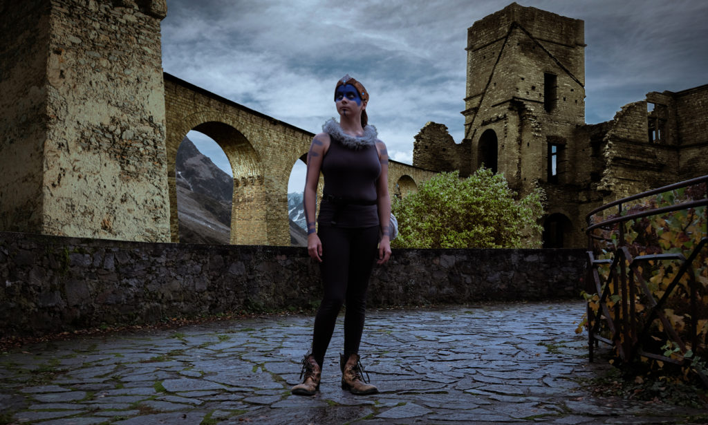 Picture edits of a cosplay photoshoot, inspired by scenery and design elements of Hellblade.